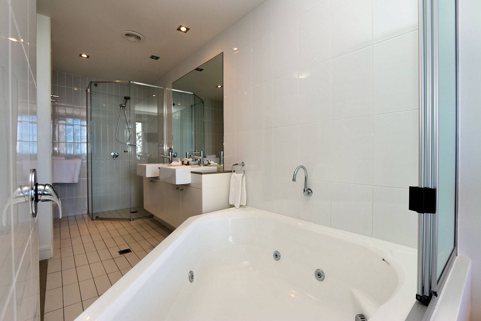 - Master bedroom suite with walk-through robe and en-suite with spa & wall mounted TV. It opens up to the sweeping timber deck and views forever.