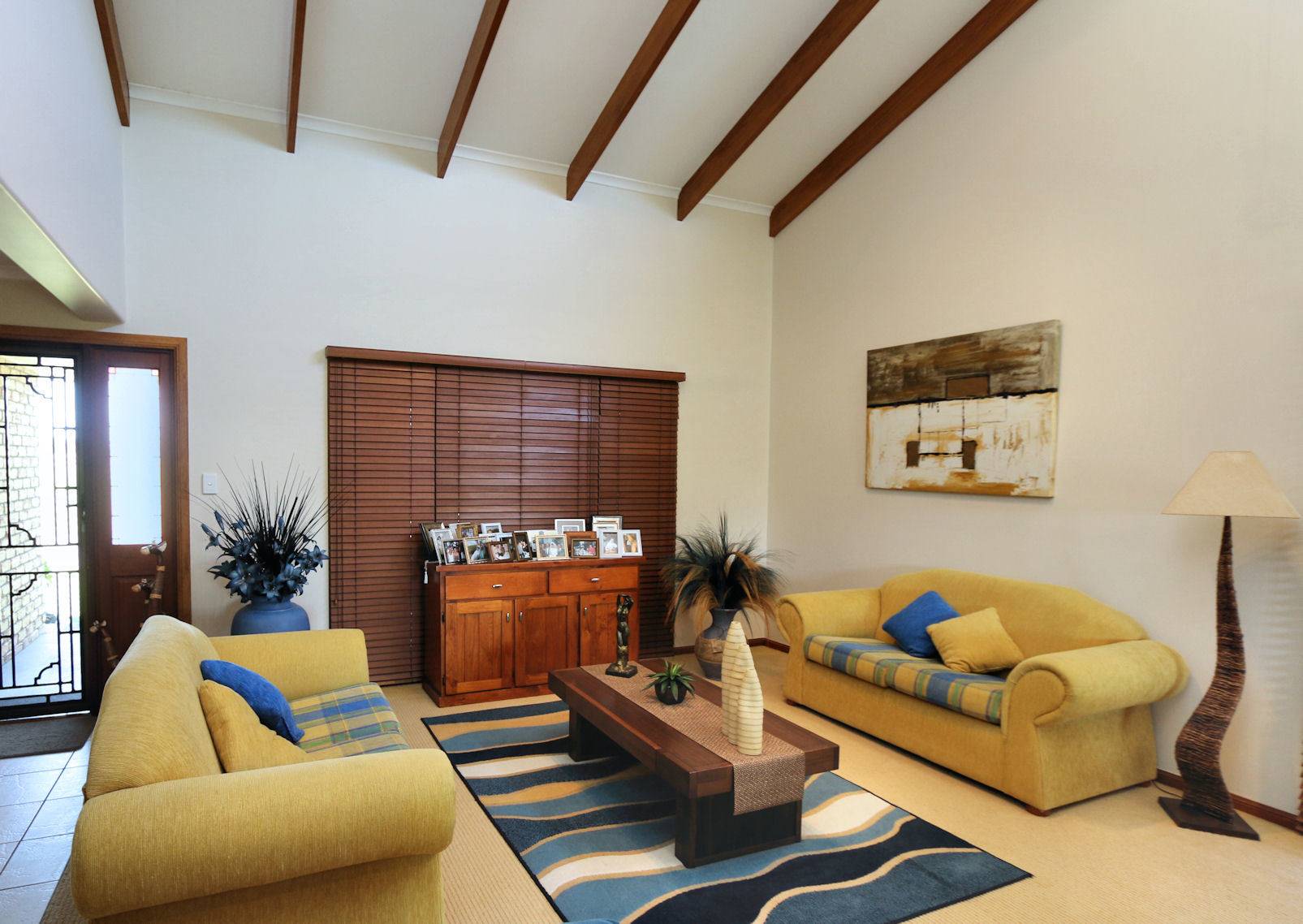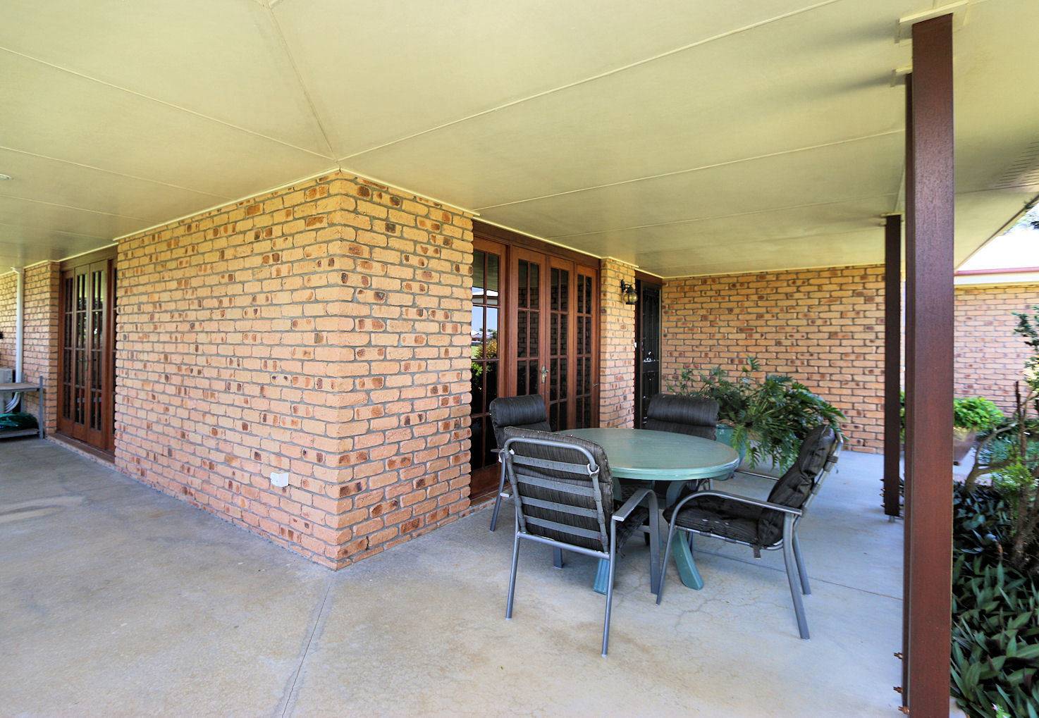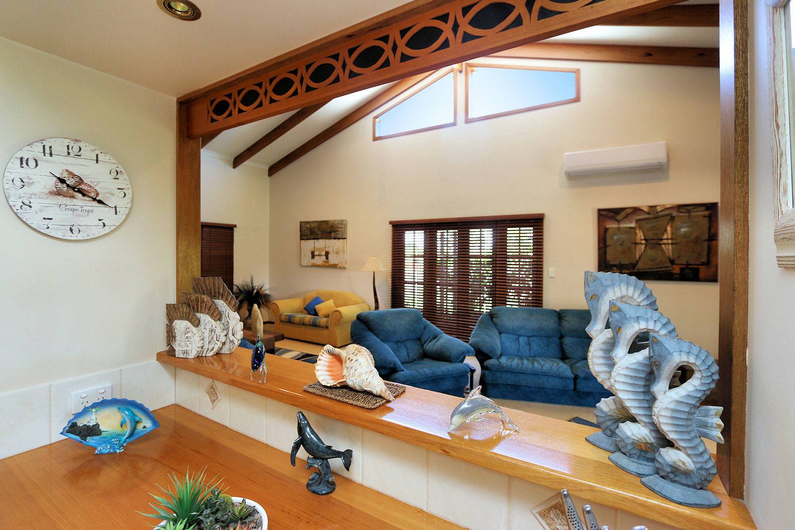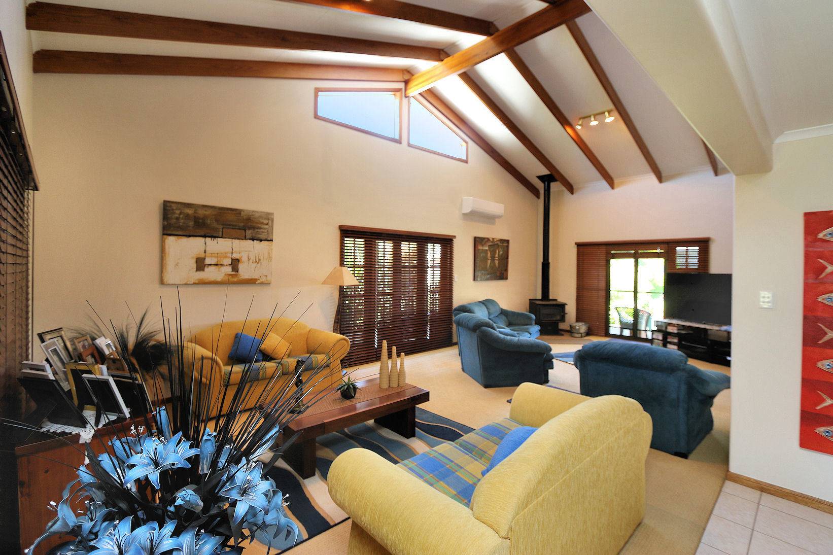 - An open plan double lounge room with raked ceilings..TV/Rumpas area and exposed timber beams...garden views, air-conditioned with French doors leading out onto the wide 270 degree verandah.