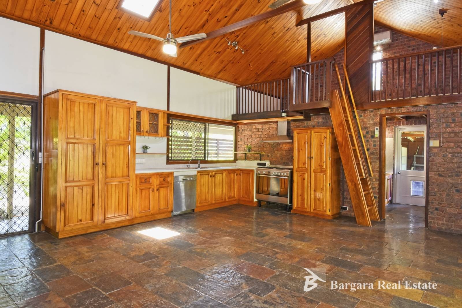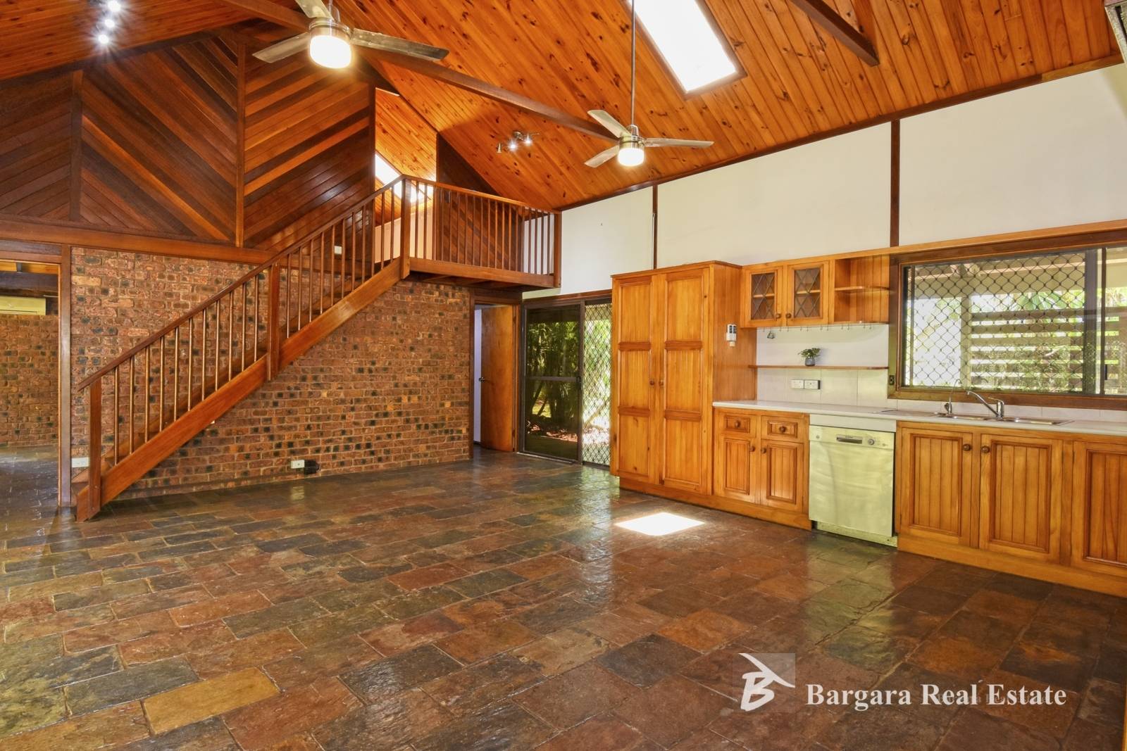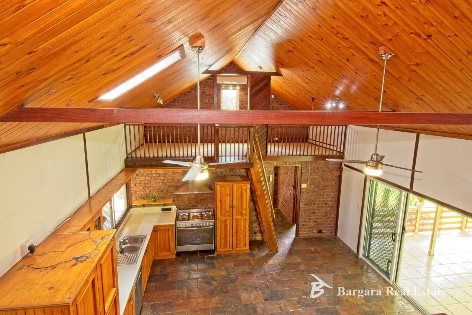 The home has a lovely open feel with vaulted wooden ceilings, slate tile flooring, exposed beams, mezzanine floor (multi use ), skylights and exposed brick featured throughout.