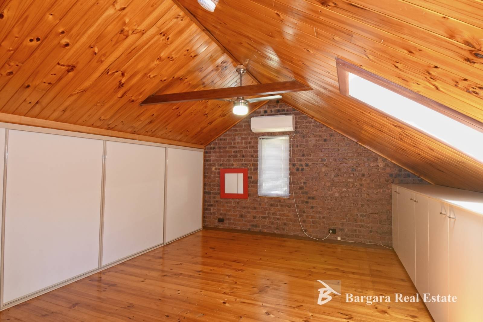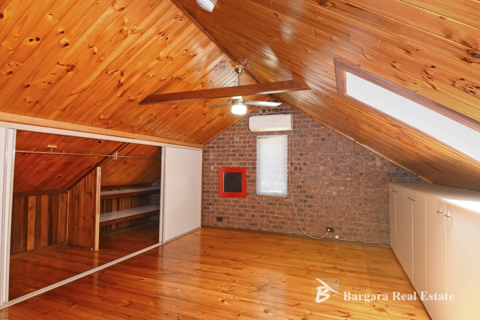 * The private master bedroom on the second level features vaulted ceilings, skylight, air-conditioning, ceiling fan, wooden floors and built-in robes and built-in cupboards.