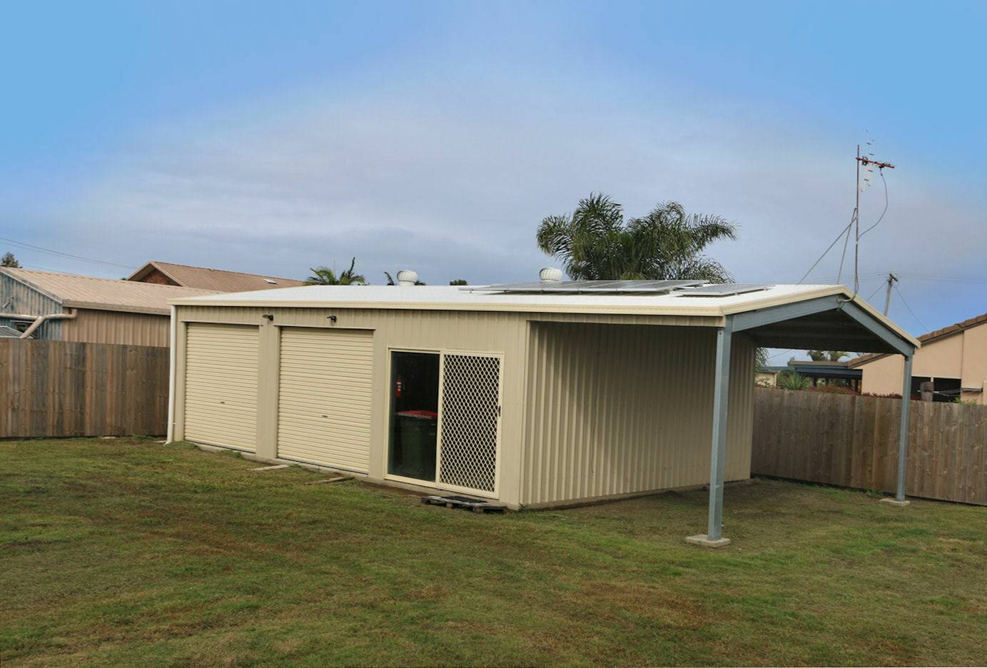 Equipped with 2.7 kw of solar power, with basic solar battery set up and whirlybirds on roof.