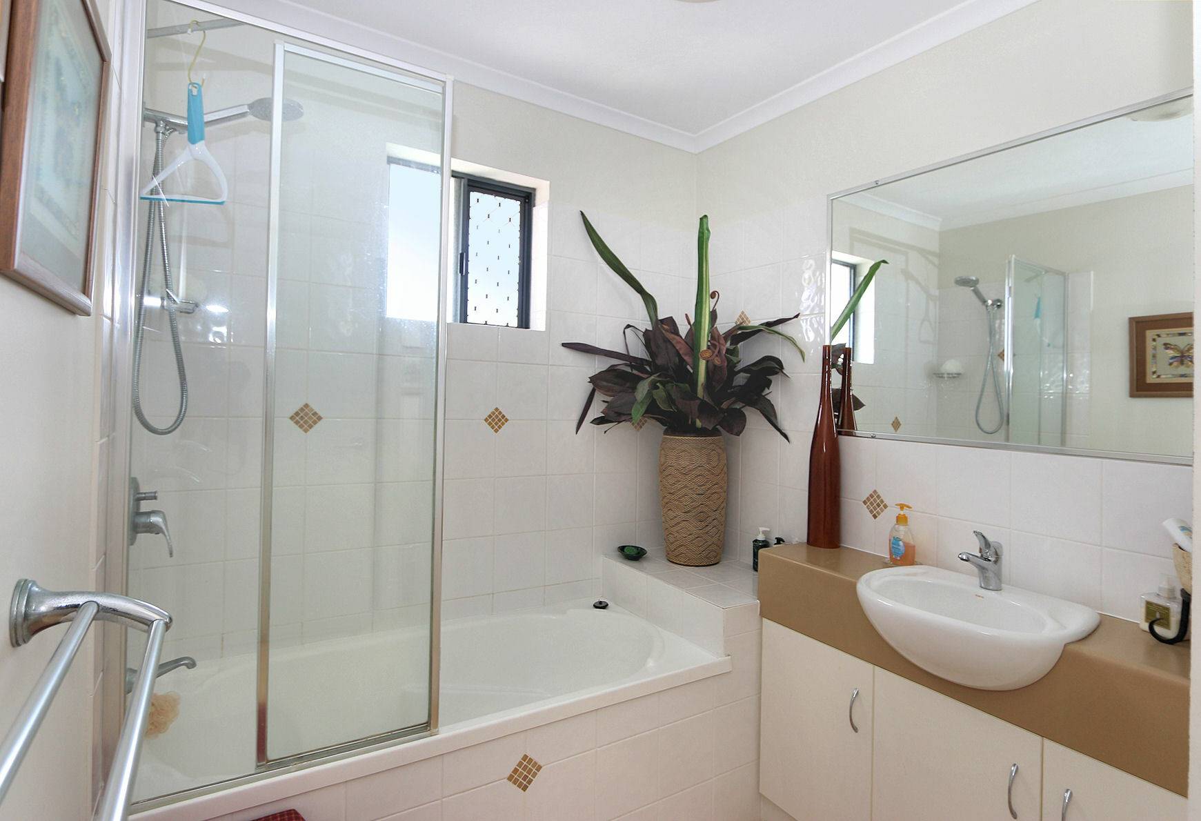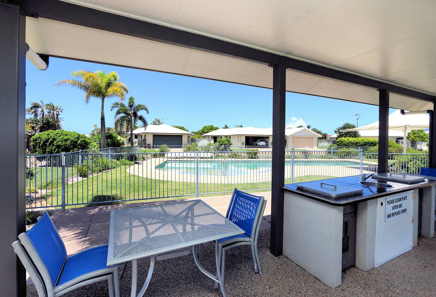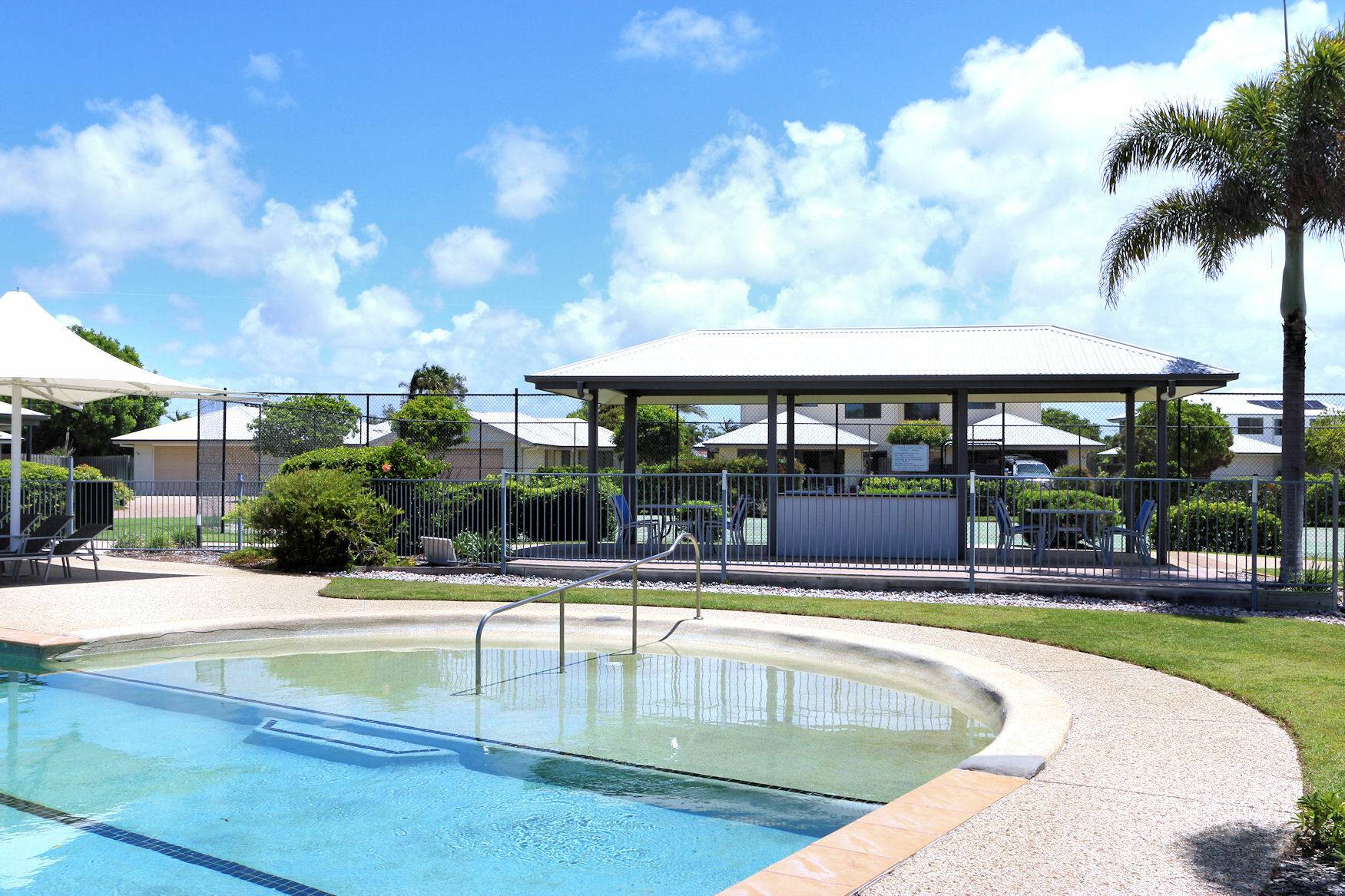 The complex offers a delightful environment with meticulously manicured gardens, a sparkling in-ground pool, BBQ facilities, tennis court, and a service bay for vehicle maintenance.