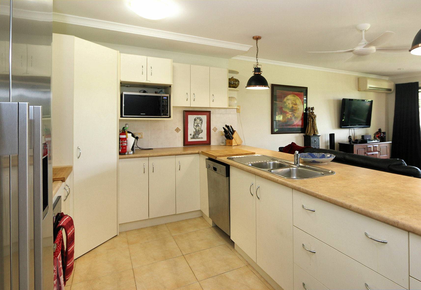 • Large, Well-Appointed Kitchen: Perfect for culinary enthusiasts, featuring a gas cooktop, electric oven, ample cupboard space, and expansive countertops.